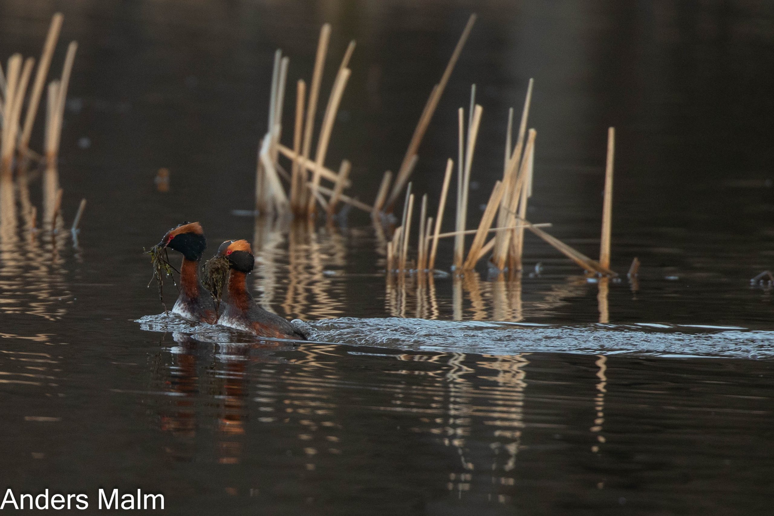 Tidigt nästa morgon åker vi till en annan liten sjö i närheten som är känd som en häckningsplats för svarthakedoppingar. En vägbank korsar sjön och från den kan man hitta låga fotovinklar nära fåglarna.