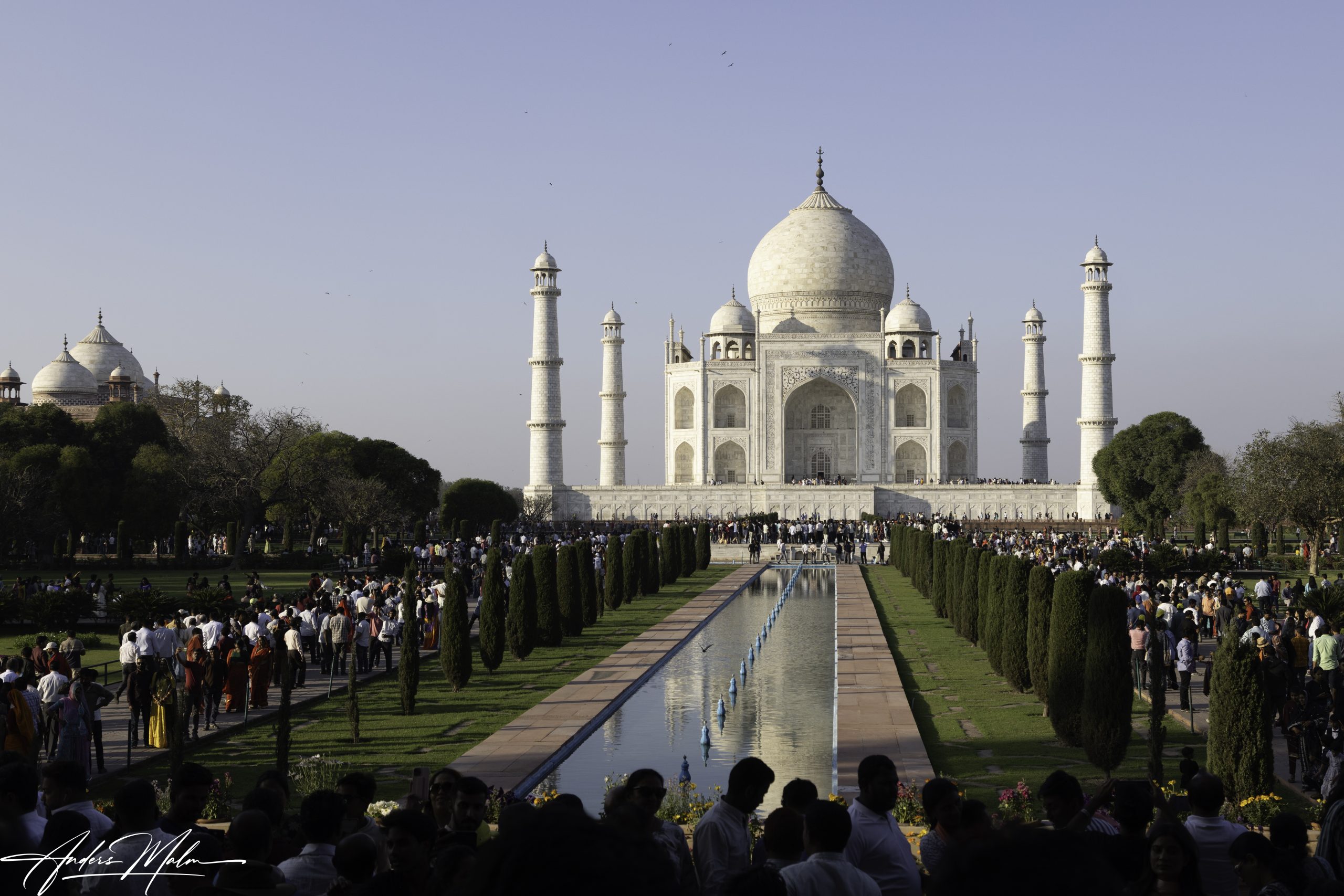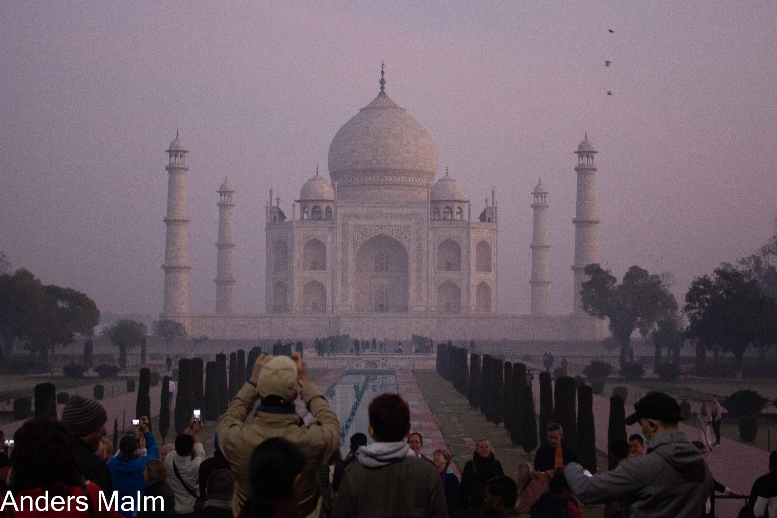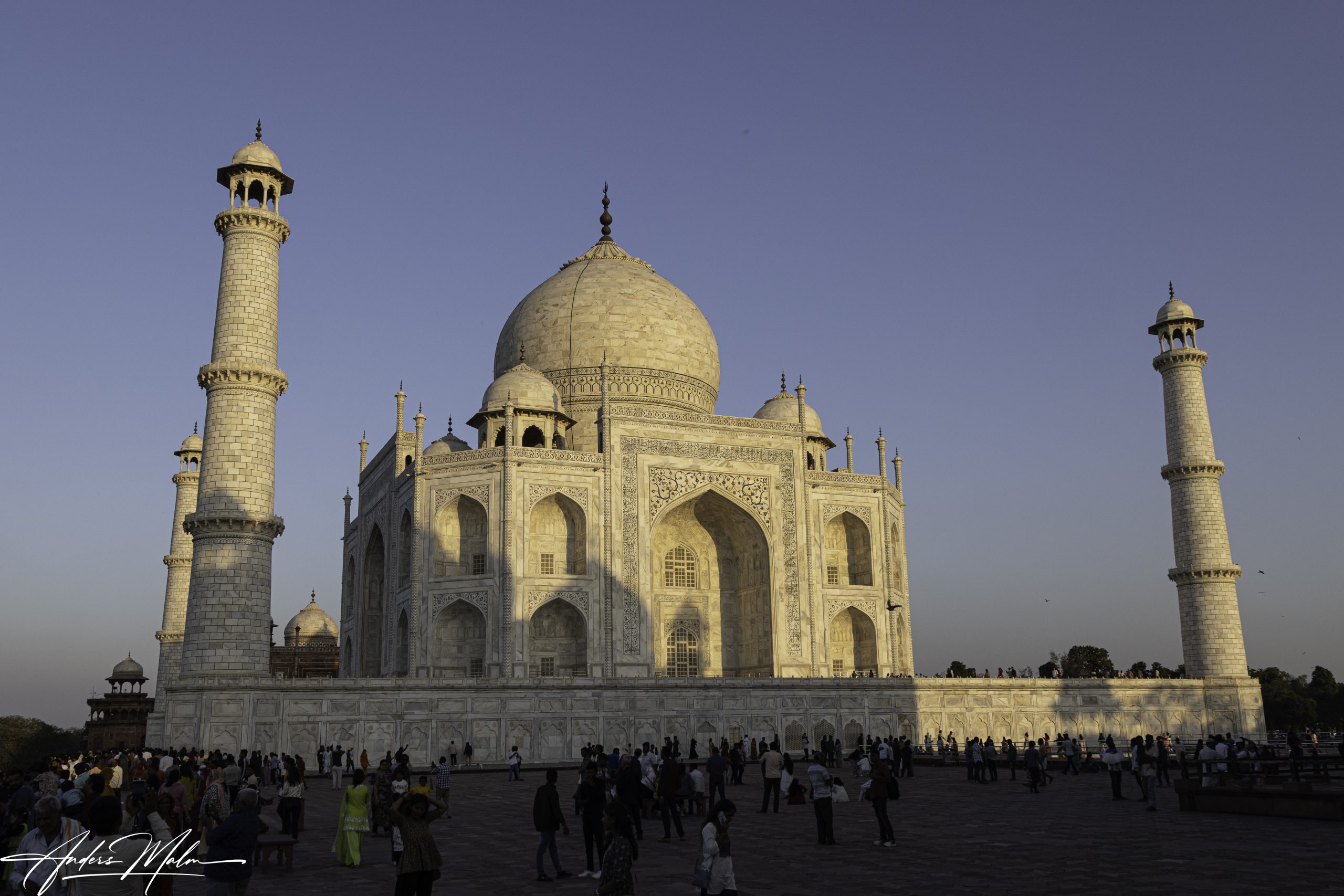 När vi tittat färdigt beger vi oss till hotellet för att senare åka för att se Taj Mahal i solnedgången. Kvällen avslutas med middag på hotellet och en drink i takbaren. Tidigt nästa morgon beger vi oss till Taj Mahal för att på nära håll se det i soluppgången. Det är ett enormt palatsområde med den det karaktäristiska gravmonumentet i vit marmor flankerat av en moské på ena sidan och en fejkkopia på andra sidan för symmetrin.