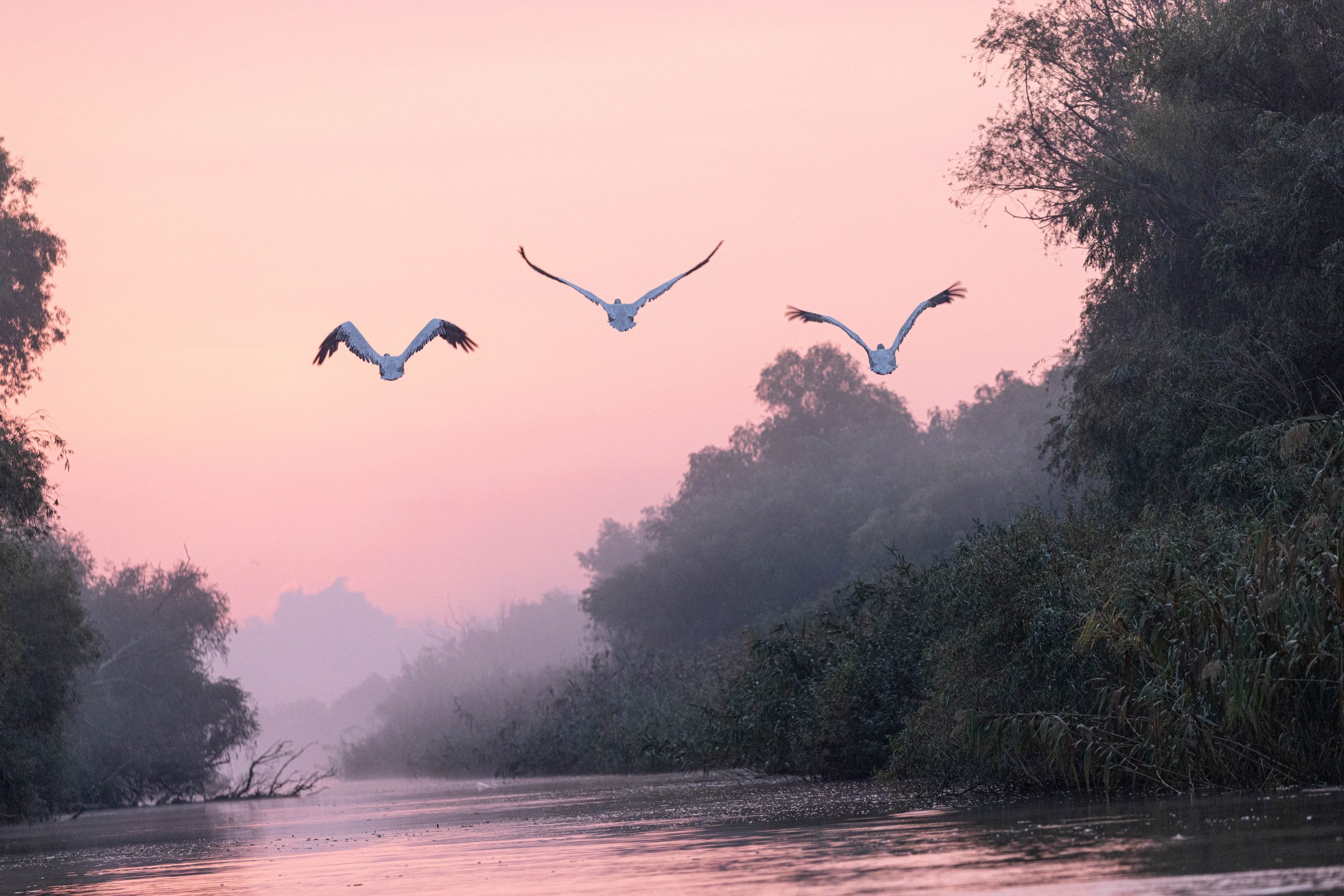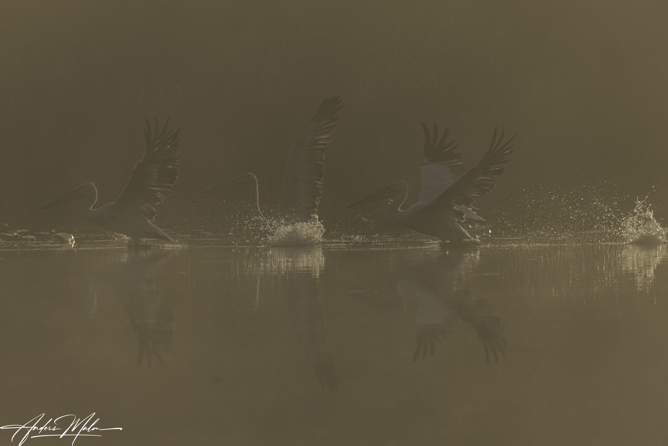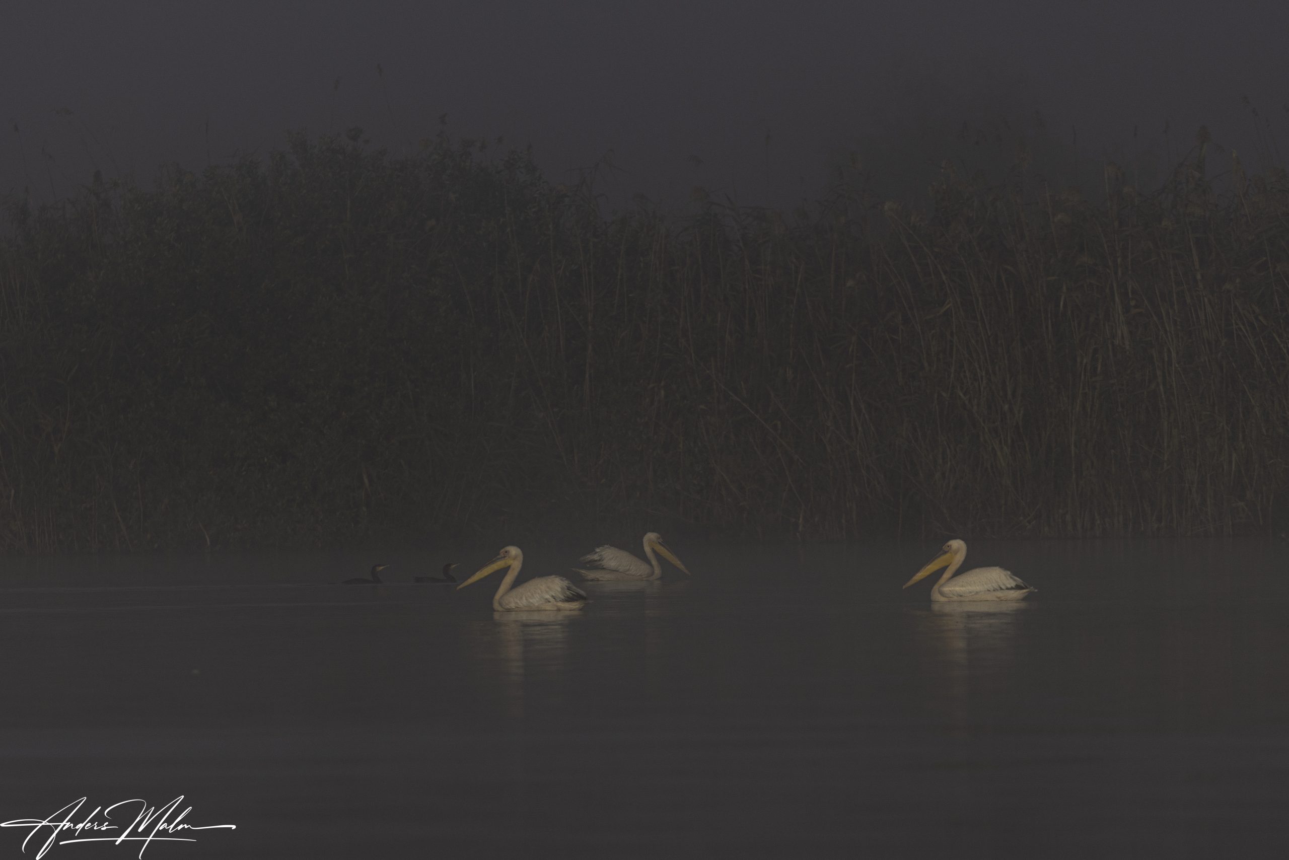 Jakten på fåglar i dimman inleds, först ett gäng Pelikaner